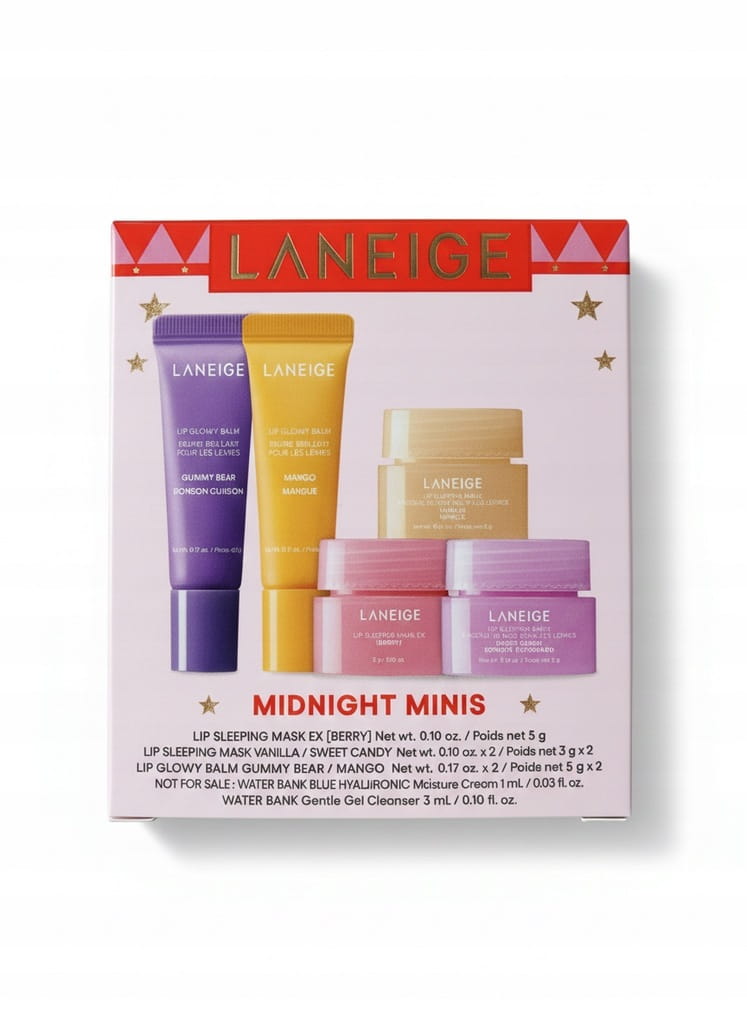 Laneige Midnight Minis Set to idealnie skomponowany zestaw dwóch bestsellerowych linii produktów, które zapewniają kompleksową pielęgnację ust o każdej porze dnia. Łączy w sobie intensywną, nocną regenerację z lekką, ochronną pielęgnacją dzienną. W skład zestawu wchodzą maski nocne Lip Sleeping Mask, które usuwają martwy naskórek podczas snu, oraz balsamy Lip Glowy Balm, nadające wargom subtelny blask i nawilżenie w ciągu dnia. To doskonały sposób na przetestowanie różnych smaków i zapewnienie ustom efektu miękkości oraz zdrowego wyglądu.