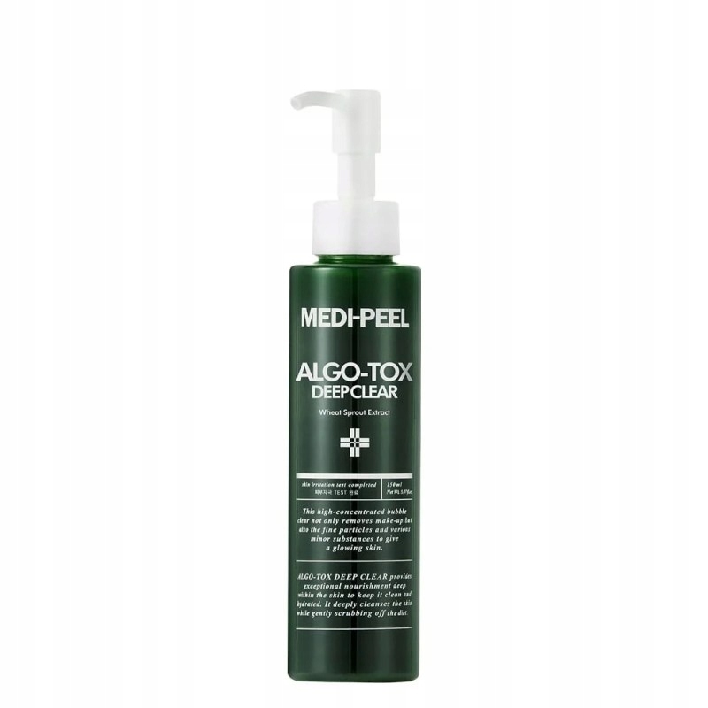Medi-Peel Algo-Tox Deep Clear to wysokoskoncentrowany preparat do głębokiego oczyszczania twarzy, który łączy w sobie funkcję żelu myjącego, maski detoksykującej oraz peelingu enzymatycznego. Produkt oparty jest na innowacyjnej technologii „samopieniącej”, która w kontakcie ze skórą przekształca się w gęstą mikropianę tlenową. Pęcherzyki aktywnego tlenu penetrują ujścia gruczołów łojowych, skutecznie usuwając zanieczyszczenia pyłowe (PM 2.5), pozostałości makijażu oraz nadmiar sebum, bez konieczności agresywnego pocierania naskórka. Dzięki wysokiej zawartości chlorofilu oraz ekstraktów z kiełków, żel działa jak „zielony koktajl” dla cery, dotleniając komórki i neutralizując skutki stresu oksydacyjnego oraz zanieczyszczenia środowiskowego.