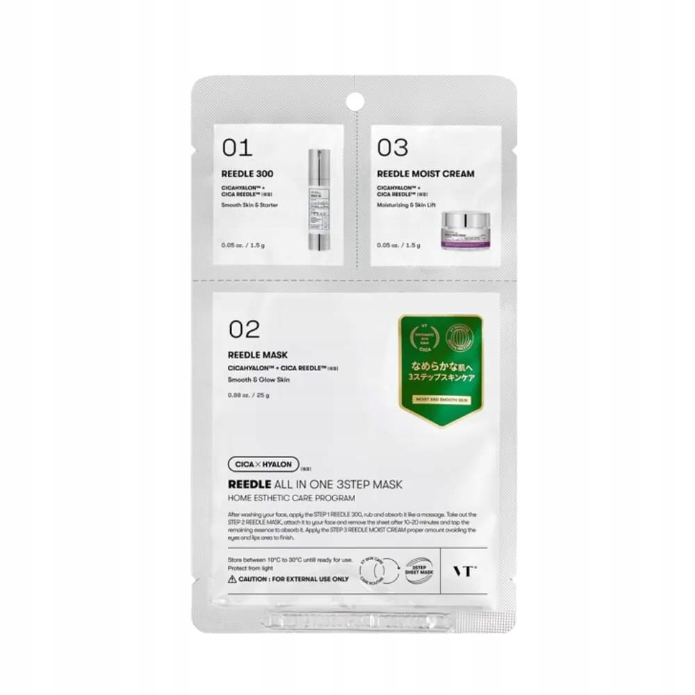 VT Cosmetics Reedle Shot All-In-One 3-Step Mask to kompleksowy zestaw pielęgnacyjny, który ma na celu głębokie nawilżenie skóry, poprawę jej elastyczności oraz nadanie jej zdrowego blasku. Produkt wykorzystuje technologię CICA REEDLE™, opartą na mikrocząsteczkach pochodzenia mineralnego, które działają podobnie do mikronakłuwania, umożliwiając głębszą penetrację składników aktywnych.